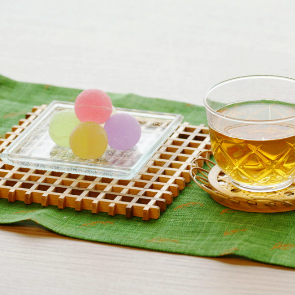 夏らしい鮮やかな色合いがSNS上でも映えるスイーツとしてご紹介するのは、徳島の名店「菓游 茜庵」がお届けする錦玉菓子「ゆうたま」。商品が小さいのでピラミッド型に並べるなど、重ね合わせて立体感を出すと美しい構図になります。光は順光よりはやや横からあて、うっすらと影を作るようにするとより奥行きのある写真に。最後に演出として、涼しげなガラスのコップなどに氷を入れ、冷たいお茶を注げば、夏を感じる写真が完成。少し時間をおきコップが結露したところを狙うと、お茶の清涼感も伝わる一枚に仕上がります。商品が落ち着いた色合いなので、加工をする場合は、コントラストや彩度は控えめにするのがポイントです。